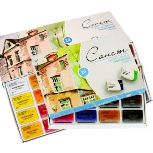 The high quality of Ladoga watercolours guarantees production techniques and control at every stage. Expensive inorganic pigments are replaced with less permanent organic light. Ladogi is characterized by an optimal value which makes it ideal for active and many painting artists and students. Colours included: Zinc White, Lemon, Hanza Yellow, Yellow Ocher, Raw Sienna, Golden, Orange Lake, Red Ocher, English Red, Scarlet, Rose, Madder Lake Red Light, Violet Rose, Blue Lake, Ultramarine, Bright Blue, Turquoise Blue, Yellow Green, Green, Emerald Green, Umber, Burnt Umber, Sepia, Neutral Black. Available in a set of 24 colours 2.5 ml pans.