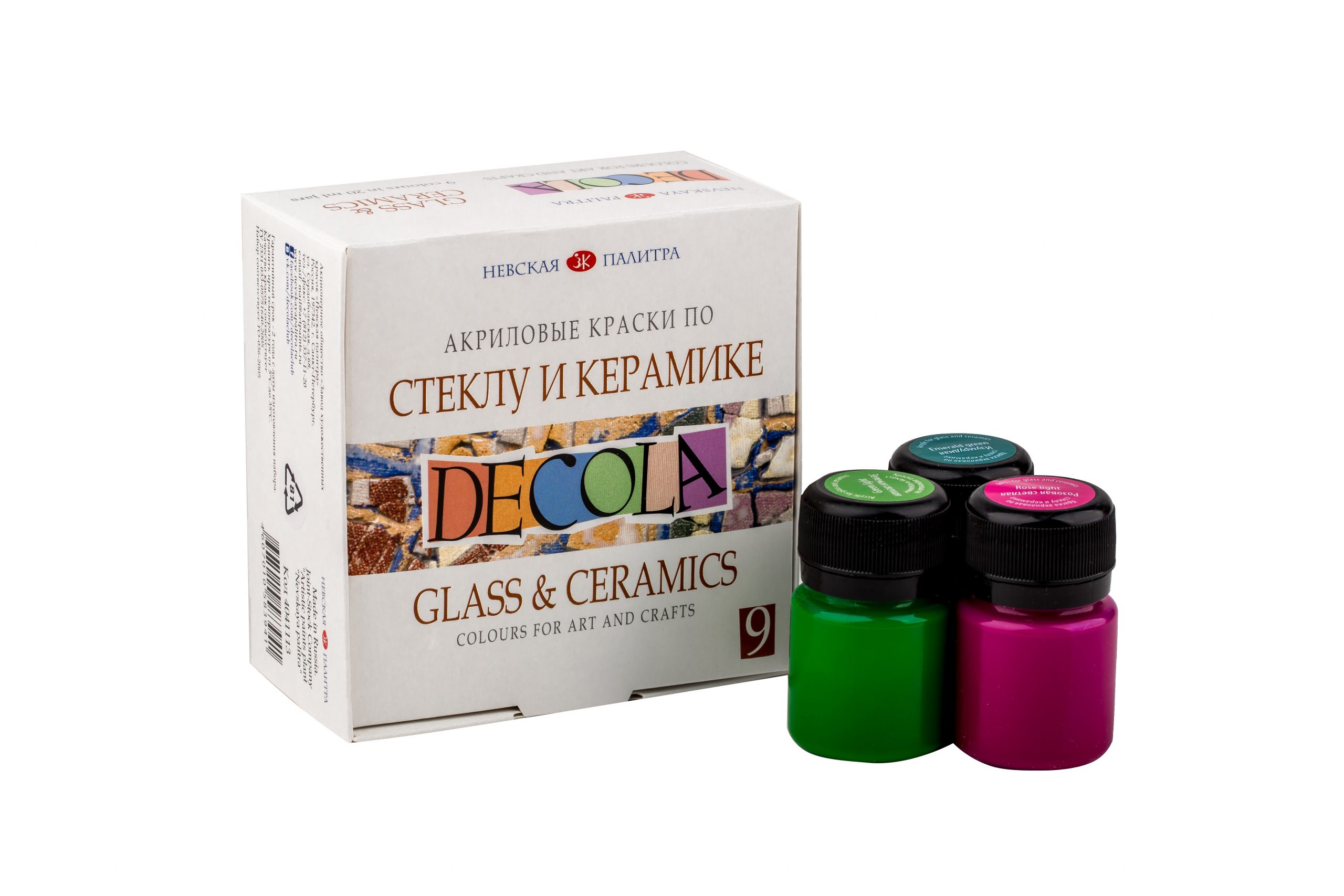Decola glass and ceramic paints are water-based, so they don’t have any unpleasant smell, like lacquer-based ones. For application you’ll need a quite soft synthetic brush as consistency is semi-translucent. We recommend having 2 coats of paint as just a single coat doesn’t have enough coverage and a bit seen-through. It’s always better to use light colors first for the same reason. As an advantage, you can achieve great glazing effects with these paints.