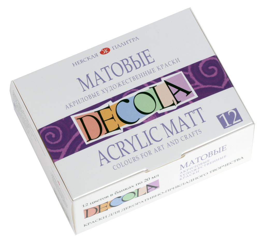 Acrylic colours "Decola" are applied for painting onto different surfaces, they don't crack and strongly keep not only on solid materials, like cardboard or wood, but also on flexible: cloth, leather, paper, ceramic and etc. After drying this type of colors forms up an elastic and bright coating. Colours are produced on a basis of water-acrylic dispersion that perfectly can be mixed with each other. High concentration of pigment provides excellent covering properties.