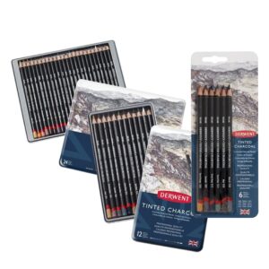 Charcoal’s black, right? Wrong! Meet Derwent Tinted Charcoal – charcoal with just a hint of colour! These pencils give you all the good points of charcoal pencils; they can be smudged and blended easily, you have great control and there’s less mess, plus you get colour with a beautiful element of charcoal ‘blackness’! Contains Sand, Burnt Orange, Sunset Pink, Glowing Embers, Heather Mist, Burnt Embers, Lavender, Thistle, Bilberry, Elderberry, Mountain Blue, Ocean Deep, Slate, Forest Pine, Green Moss, Dark Moss, Driftwood, Peat, Burnt Earth, Natural, White, Light, Medium and Dark.