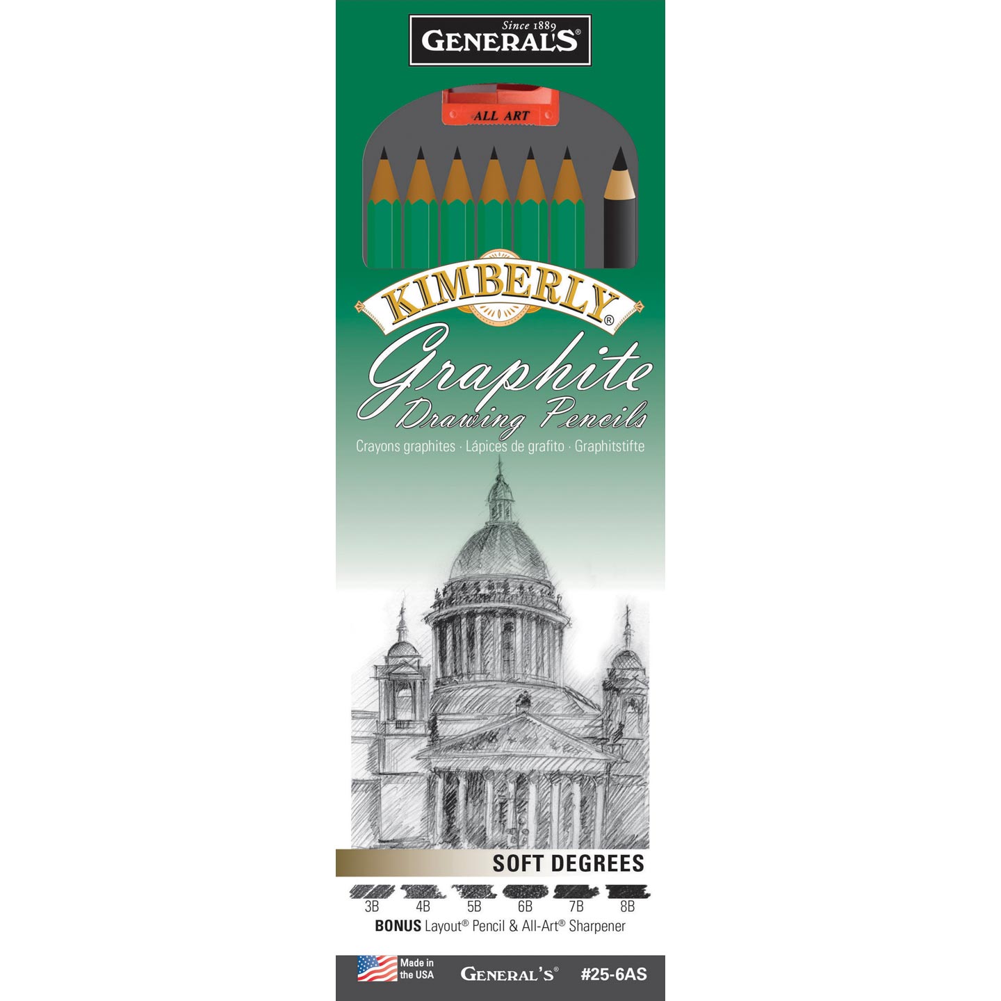 The General’s® Kimberly® Graphite Pencil Kit in soft degrees includes 3B, 4B, 5B, 6B, 7B, and 8B pencils. Kit also includes a Layout® ebony-black pencil and All-Art® sharpener. 8 pieces per package.