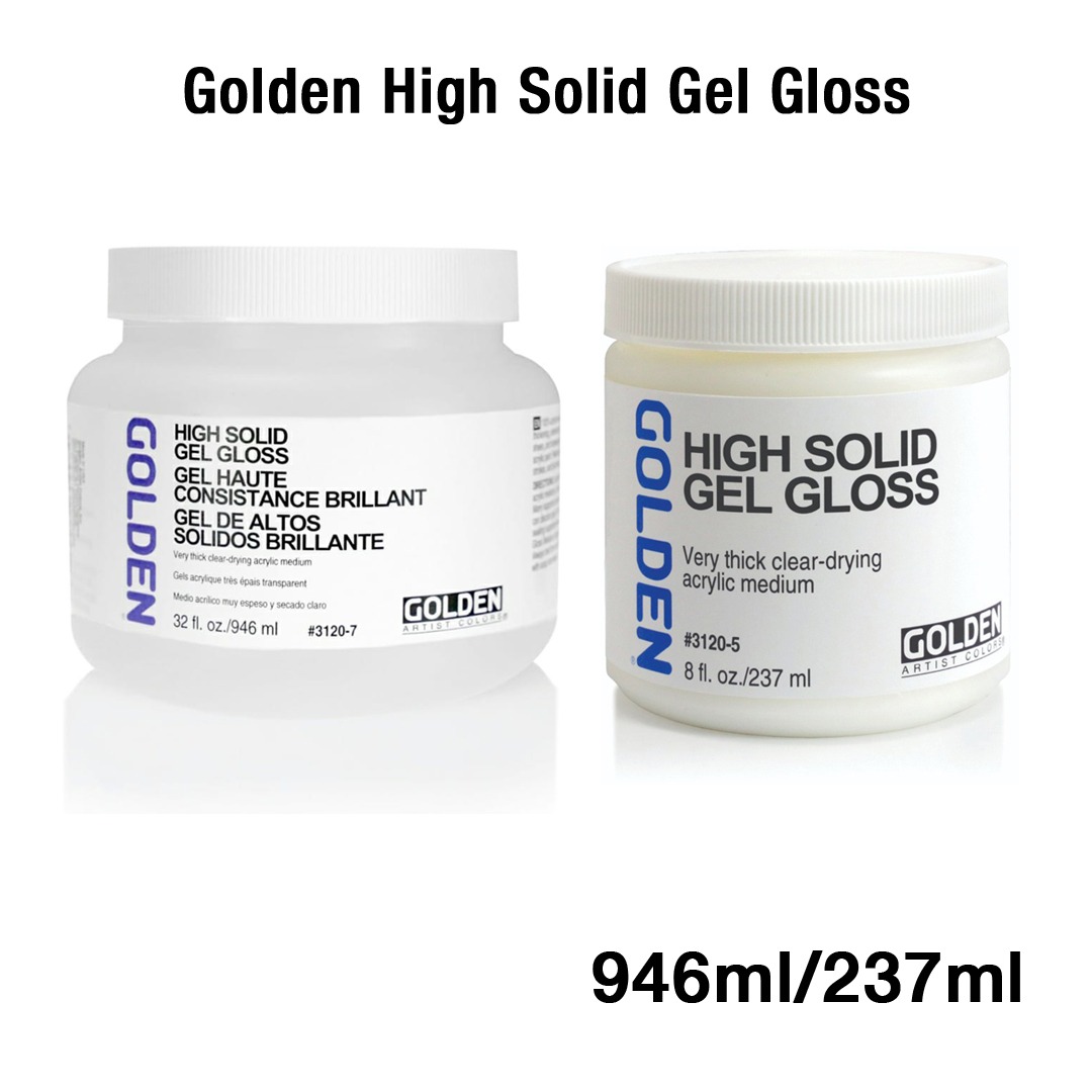 High Solid Gels (L-R: Gloss, Matte) are similar in body to Heavy Gels. They contain more acrylic solids and shrink slightly less than other gels. They blend well with colors and will retain brush strokes upon drying. Available in gloss and matte.(Item # Gloss – 3120, Matte – 3130);